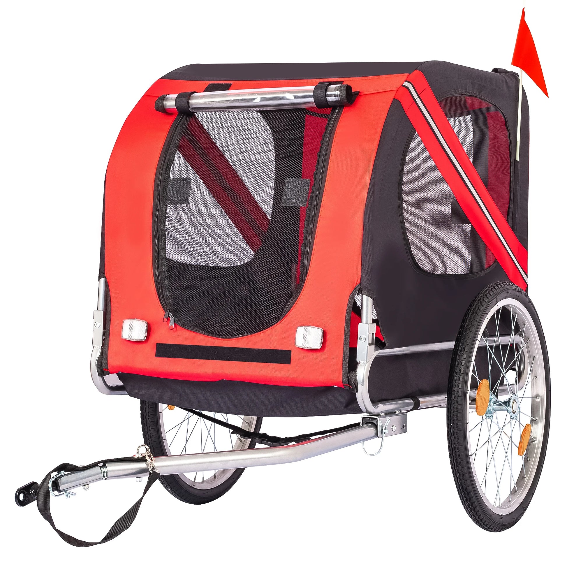 【All-Terrain Stability for Smooth Rides】Take adventures anywhere without rough bumps! Equipped with 16" air-filled tires and deep treads, this pet bike trailer glides smoothly over roads, trails, and uneven terrain. Lightweight alloy rims and built-in shock absorption reduce jolts, ensuring your pup stays comfy even on longer rides. Whether it’s a neighborhood stroll or a trail trip, this trailer handles it all!